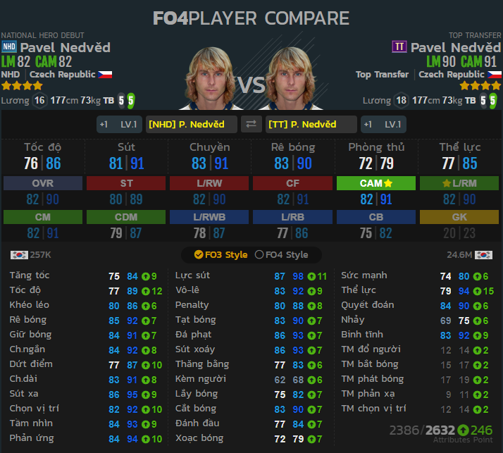 Hơi bất ngờ khi các game thủ hàn quốc lựa chọn Nedved cho vị trí thứ 4 của top các cầu thủ được đánh giá cao nhất FO4.Tuy nhiên nếu bạn đang tìm kiếm 1 vị trí tiền vệ công, tiền vệ cánh hoặc tiền vệ trung tâm CM,đừng bỏ qua Nedved TT. Chỉ số tổng quát lên tới 91, Từ tốc độ, chỉ số tấn công cho đến thể chất đều vượt trội hoàn toàn so với thẻ NHD.Với bộ chỉ số có sơ đồ hình lục giác cực kì đồng đều và khả năng hiệu quả trong việc tấn công khiến Nedved trở thành cái tên được ưa chuộng bậc nhất trên hàng công. AI của Nedved TT cũng được đánh giá là vô cùng thông minh và khôn khéo. Không còn nghi ngờ khi đây là một trong số những cái tên sẽ làm mưa làm gió trong FO4 thời gian tới.