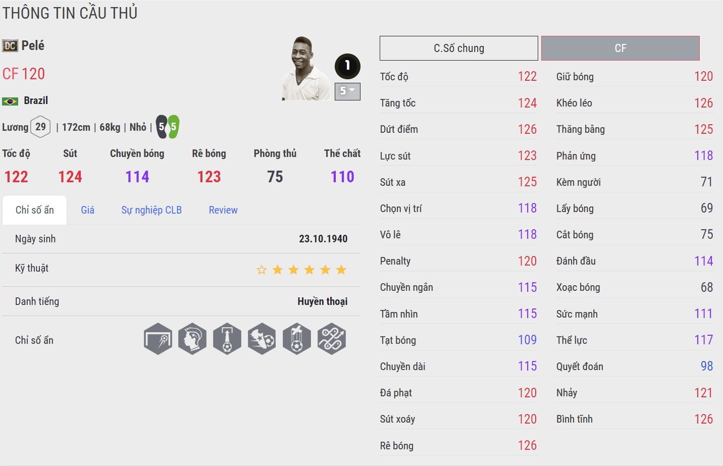 Pele DC hiện tại là một trong những mùa thẻ có giá trị tốt, dễ tiếp cận cả về giá cả lẫn hiệu suất sử dụng. Cụ Pele nổi bật với tốc độ và khả năng dứt điểm nhạy bén, AI di chuyển thông minh, cùng với kỹ năng rê bóng xuất sắc, đặc biệt là khả năng rê bóng chậm, điều này đã nâng cao giá trị của Pele rất nhiều.
