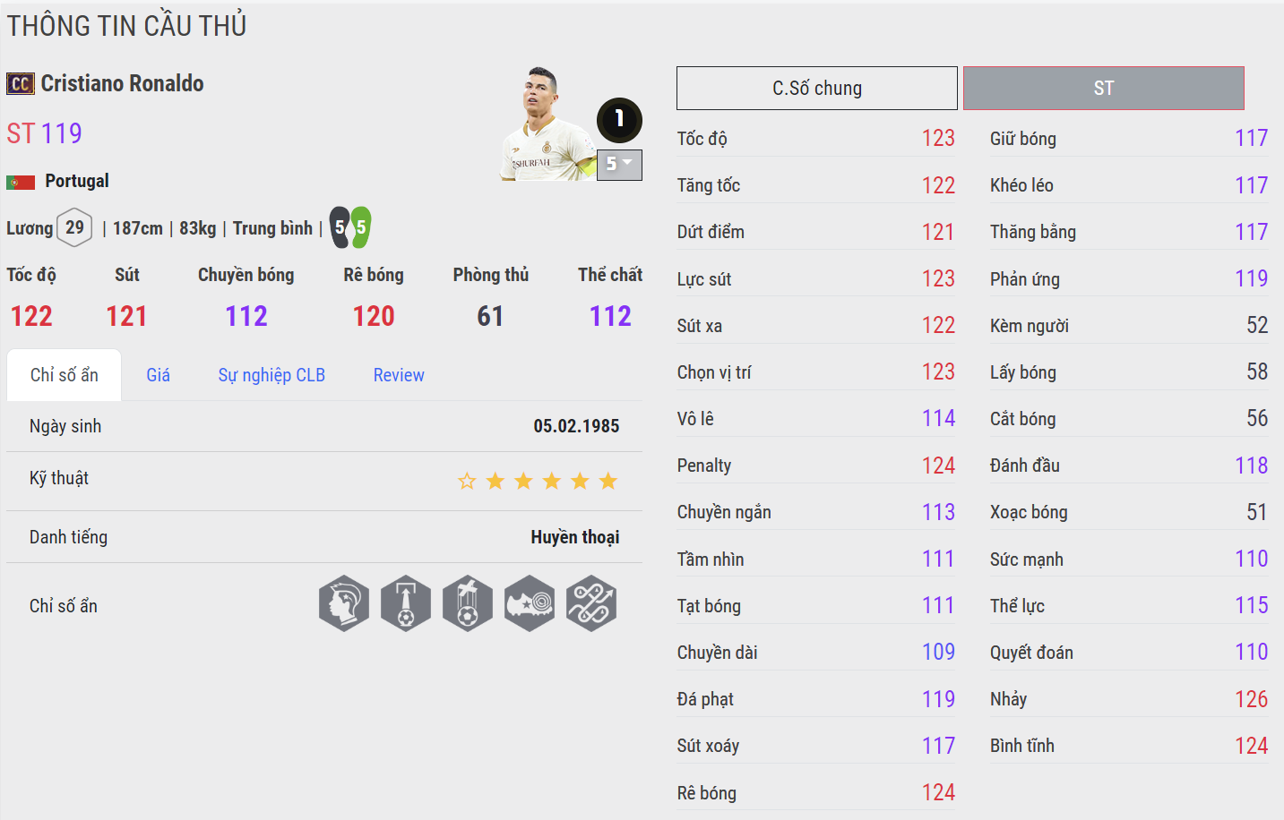 Cristiano Ronaldo CC hiện tại vẫn là cái tên số một trong FC Online. Sở hữu tốc độ ấn tượng, thể hình lý tưởng, và lối chơi toàn diện, CR7 nổi bật với khả năng di chuyển thông minh, kỹ năng dứt điểm chính xác cả trong và ngoài vòng cấm. Khả năng không chiến xuất sắc giúp CR7 trở thành một tiền đạo toàn diện và có thể phù hợp với hầu hết các sơ đồ chiến thuật, tạo nên sự khác biệt đáng kể.