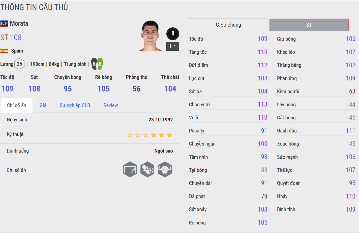 Morata trong mùa giải EU24 được biết đến với khả năng sở hữu 2 chân 5 sao và bộ chỉ số tốc độ, dứt điểm và sút xoáy tốt. Sự linh hoạt trong việc di chuyển của anh sẽ tạo ra nhiều cơ hội nguy hiểm. Khả năng tranh chấp không chiến tốt kèm theo việc anh thuộc team color của Tây Ban Nha, một đội có tiềm năng, giúp Morata có thể phát triển thêm trong tương lai.