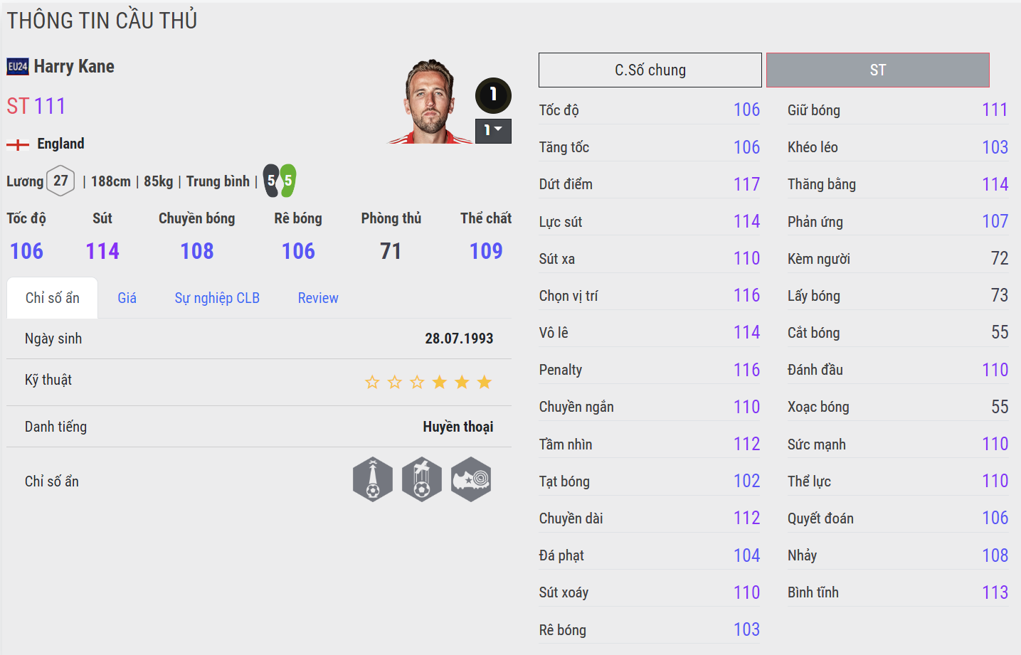 Kane không thể không được nhắc đến trong danh sách các tiền đạo hàng đầu của mùa giải EU24. Với 2 chân 5 sao và khả năng chuyền bóng và dứt điểm xuất sắc, anh là một lựa chọn ổn định và hiệu quả. Là một phần quan trọng của đội tuyển Anh, một ứng cử viên mạnh mẽ cho chức vô địch, Kane là một sự đầu tư đáng giá cho bất kỳ HLV nào.