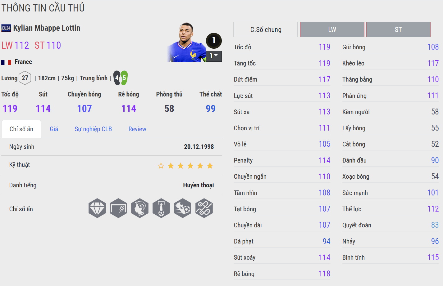 Mbappe, mặc dù không phải là một tiền đạo thuần túy nhưng với tốc độ và kỹ năng dứt điểm của mình, anh đã chứng minh mình là một trong những tiền đạo hàng đầu trong mùa giải EU24. Dù không sở hữu 2 chân 5 sao, nhưng hiệu suất ghi bàn và khả năng thể hiện của anh trong màu áo đội tuyển Pháp là điều đáng chú ý cho bất kỳ HLV nào.