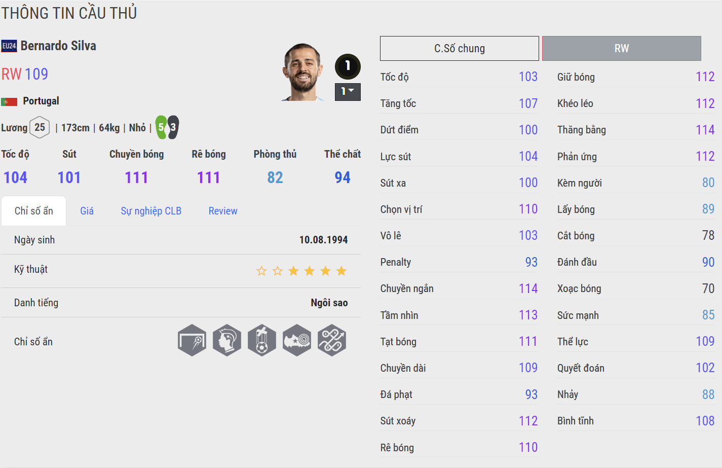 Bernardo Silva không quá nhanh, nhưng nổi bật với khả năng chuyền, rê dắt và dứt điểm ổn định. Mặc dù tì đè không phải điểm mạnh, kỹ năng rê bóng uyển chuyển khiến anh trở thành lựa chọn đáng giá ở cánh.