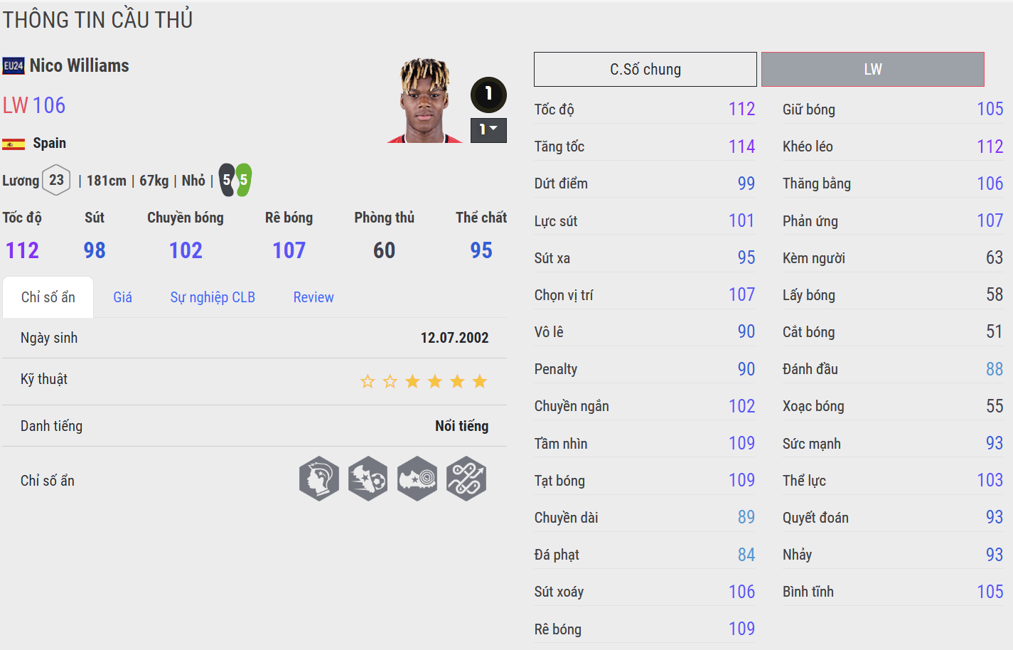 Nico Williams đang gây chú ý ở cả đời thực lẫn trong game. Với 2 chân 5-5, tốc độ tốt, khả năng rê bóng dẻo dai và chuyền tạt ấn tượng, điểm yếu duy nhất là khả năng dứt điểm còn hạn chế.