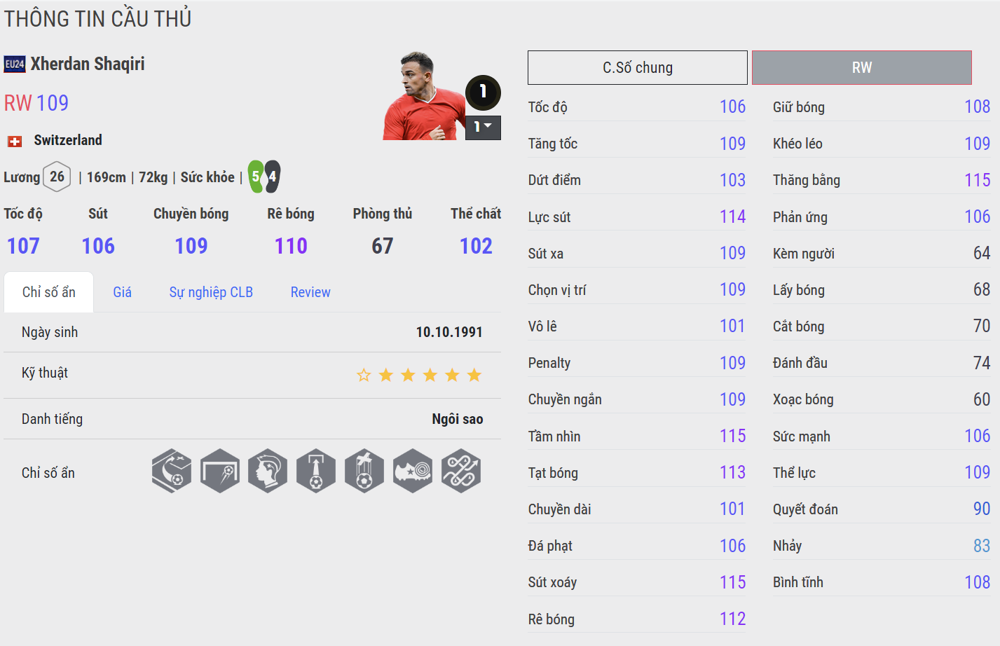 Shaqiri luôn thi đấu xuất sắc trong các giải lớn như World Cup và Euro. Trong game, anh có tốc độ ổn định, kỹ năng dứt điểm xuất sắc với những cú sút xa và ZD ấn tượng. Ngoài khả năng sút, Shaqiri còn mạnh trong tì đè và rê bóng, cùng kỹ năng chuyền đạt hiệu quả cao.