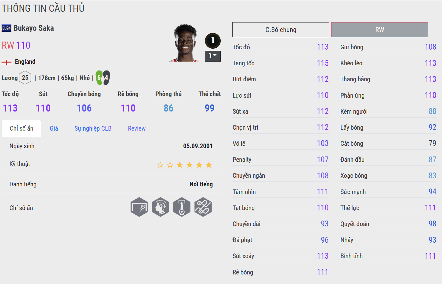 Saka có tốc độ nhanh, kỹ năng rê bóng ấn tượng và chỉ số dứt điểm cải thiện rõ rệt so với các mùa trước. Khả năng bám biên và xâm nhập của anh trong phiên bản EU24 rất nổi bật, được đánh giá cao ở thời điểm hiện tại.