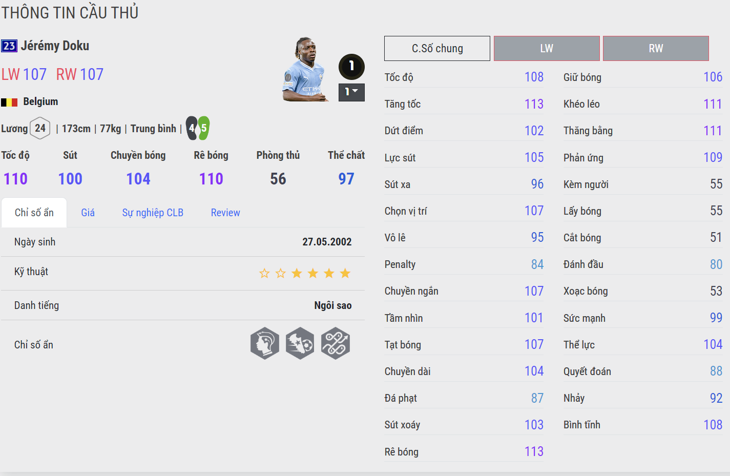Tiền đạo cánh người Bỉ đang giành được rất nhiều sự quan tâm ở thời điểm hiện tại khi đang dần thi đấu nổi trội dưới bàn tay nhào nặn của Pep Guardiola. Doku sở hữu tốc độ tốt, kỹ năng xử lý bóng cực kì dẻo và khả năng tì đè khỏe cùng kỹ năng tạt bóng rất ổn. Tuy nhiên Doku lại chưa phải mẫu cầu thủ có khả năng dứt điểm tốt, vì vậy cần hạn chế thực hiện những tình huống sút xa với Doku.