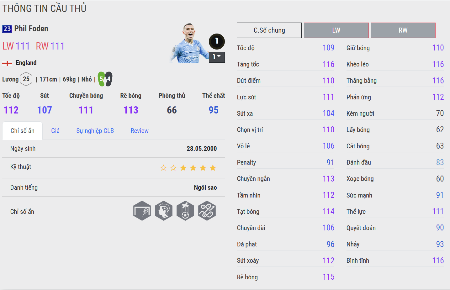 Sở hữu tốc độ tốt, kỹ năng dứt điểm ổn đặc biệt là khả năng ZD có độ xoáy rất tốt. Khả năng rê dắt bóng dẻo cùng bộ kỹ năng xử lý bóng rất mượt, Foden là cái tên đáng dùng hàng đầu nơi hành lang cánh của Man City. Sở hữu khả năng tạt bóng rất xoáy cùng khả năng chuyền bóng tốt. Điểm yếu của Foden có lẽ là ở khả năng tì đè không quá nổi bật và sức rướn chưa thực sự tốt.