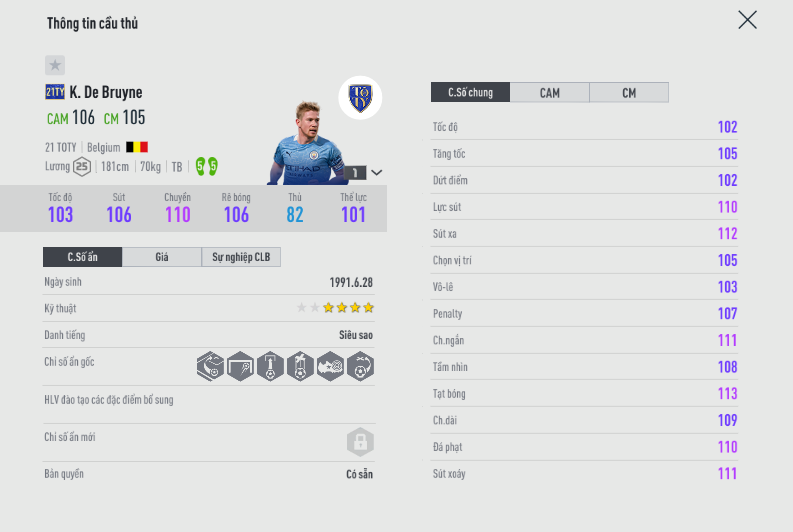 Tiền vệ là động cơ của MC, hiện đang chơi cực hay và trong game cũng là một trong những tiền vệ đương đại được nhiều người sử dụng nhất. Mùa giải 21TY cho chúng ta một chân chuyền và một đại bác cực đỉnh, với khả năng đóng xa cực khét.