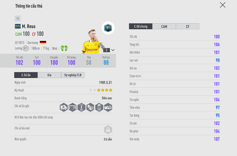 Mặc dù Reus có thể đá như một tiền đạo hay hộ công. Nhưng ở Dortmund luôn có những tiền đạo theo đúng nghĩa đen. Và trong suốt những năm tháng qua, Reus luôn đóng vai trò là một cầu thủ kiến thiết, một mũi khoan ở hành lang cánh. Điều đáng nói là anh ghi bàn sòn sòn. Và trong game cũng vậy, có lẽ sẽ bạn sẽ ít khi thây Reus bởi team Dortmund thường được ít người xây dựng trong game.