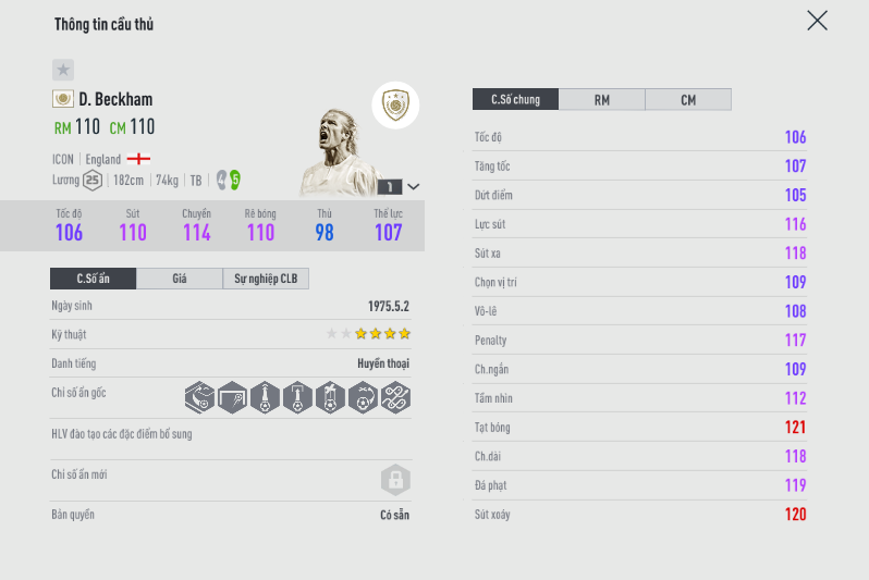 Tiền vệ huyền thoại của MU và Real. Ngay từ khi xuất hiện thì Beck ICON đã như một vụ nổ và việc sút xa của Beck như một lỗi game vậy, vung chân cực nhanh và bóng quay cũng cực ảo. Ngoài đời chúng ta thấy Beck chuyền và tạt như đặt. Còn trong game thì sút như bug game vậy