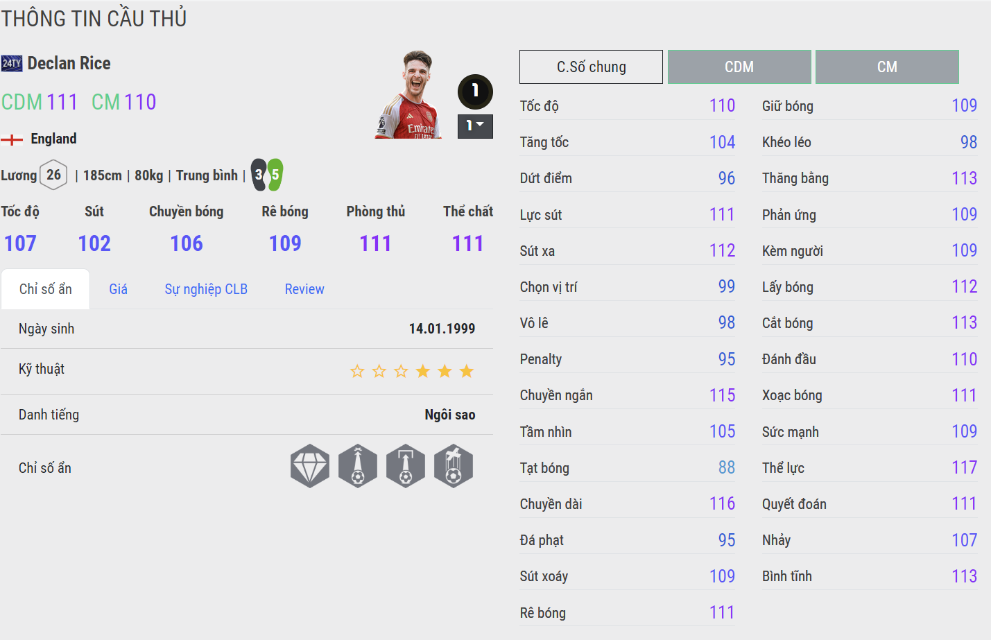 Tiền vệ trung tâm của Arsenal đang được đánh giá rất cao thời gian gần đây về sự hiệu quả ở vị trí tiền vệ trung tâm. Dù rằng mùa thẻ 24TOTY đã không còn chỉ số ẩn thánh chuyền bóng nhưng độ chính xác trong những đường chuyền cũng như kiến tạo của Rice vẫn là rất tốt. Ngoài ra, Rice sút xa cũng rất ổn với chân thuận ở một số tình huống thuận lợi. Kỹ năng phòng ngự của Rice cũng cho thấy một sự hiệu quả rõ rệt khi anh có tốc độ ổn, khả năng tắc bóng chính xác và tư duy di chuyển thông minh.