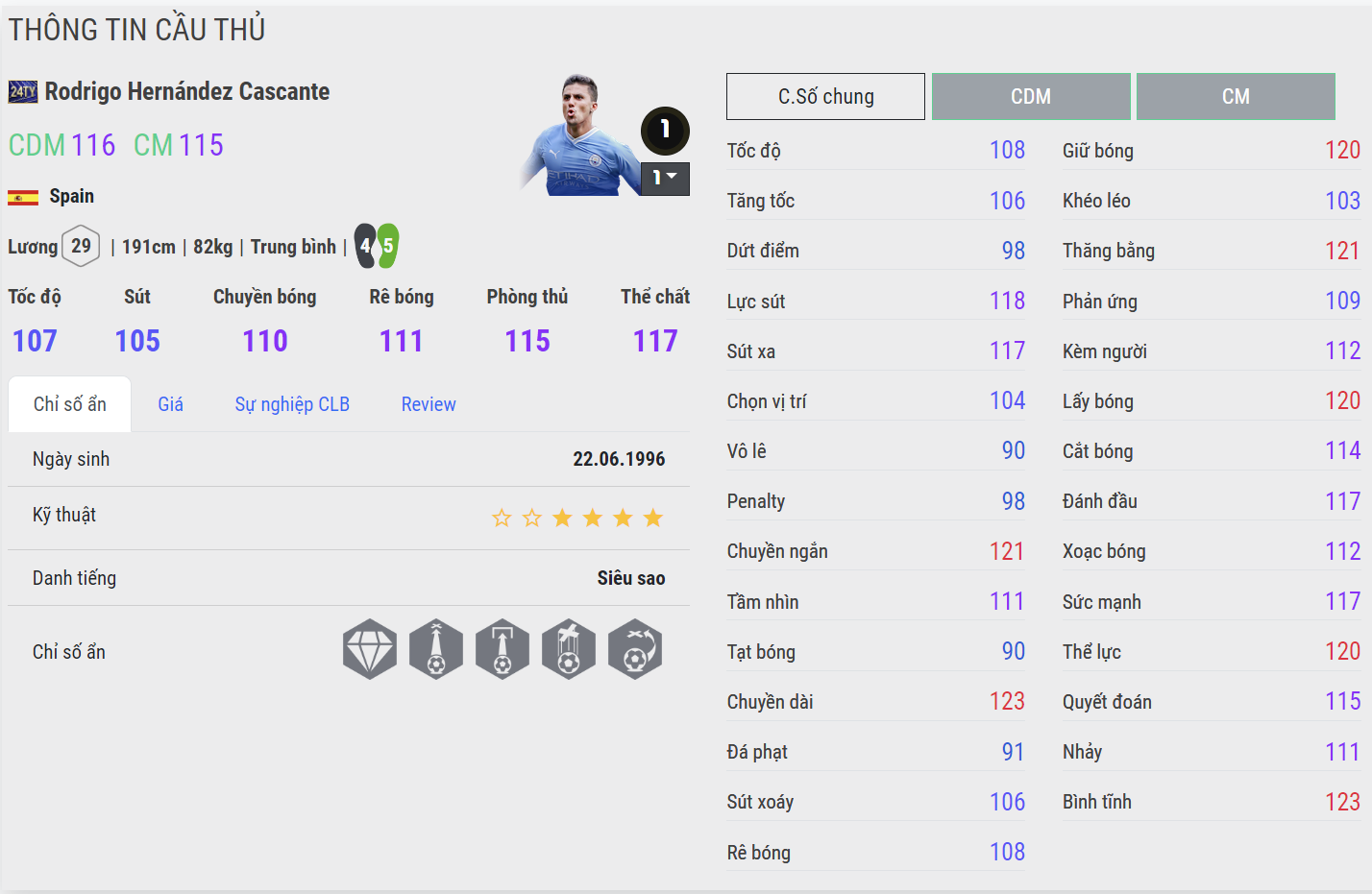Tiền vệ trung tâm của Man City được đánh giá là một trong những cái tên vô cùng toàn diện ở vị trí phòng ngự khi anh có thể hình tốt, kỹ năng phòng ngự hay và AI đánh chặn cực kì thông minh. Không những thế, khả năng sút xa của Rodri cũng là rất tốt và ổn định cùng kỹ năng chuyền bóng xuất sắc khiến anh gần như không thể bị thay thế ở thời điểm hiện tại cho team Man City ở vị trí trung tâm hàng tiền vệ.