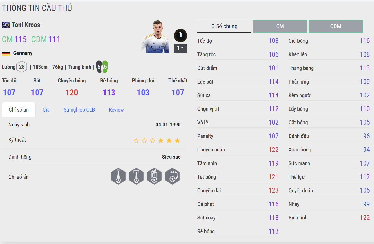 Số 8 huyền thoại của Real Madrid hiện đang được đại đa số các game thủ đánh giá là tiền vệ trung tâm hàng đầu thời điểm hiện tại. Kỹ năng chuyền bóng của Kroos là rất xuất sắc và không thua kém bất kì tiền vệ trung tâm hàng đầu nào của game thời điểm hiện tại. Khả năng xoay sở và xử lý bóng ổn cùng với kỹ năng sút xa cực kì chính xác ở cả 2 chân giúp Kroos gần như toàn diện ở khả năng hỗ trợ tấn công. Trong khi đó, kỹ năng phòng ngự của Kroos cũng được cải thiện đáng kể giúp cho việc tham gia phòng ngự với Kroos cũng trở nên vô cùng hiệu quả.
