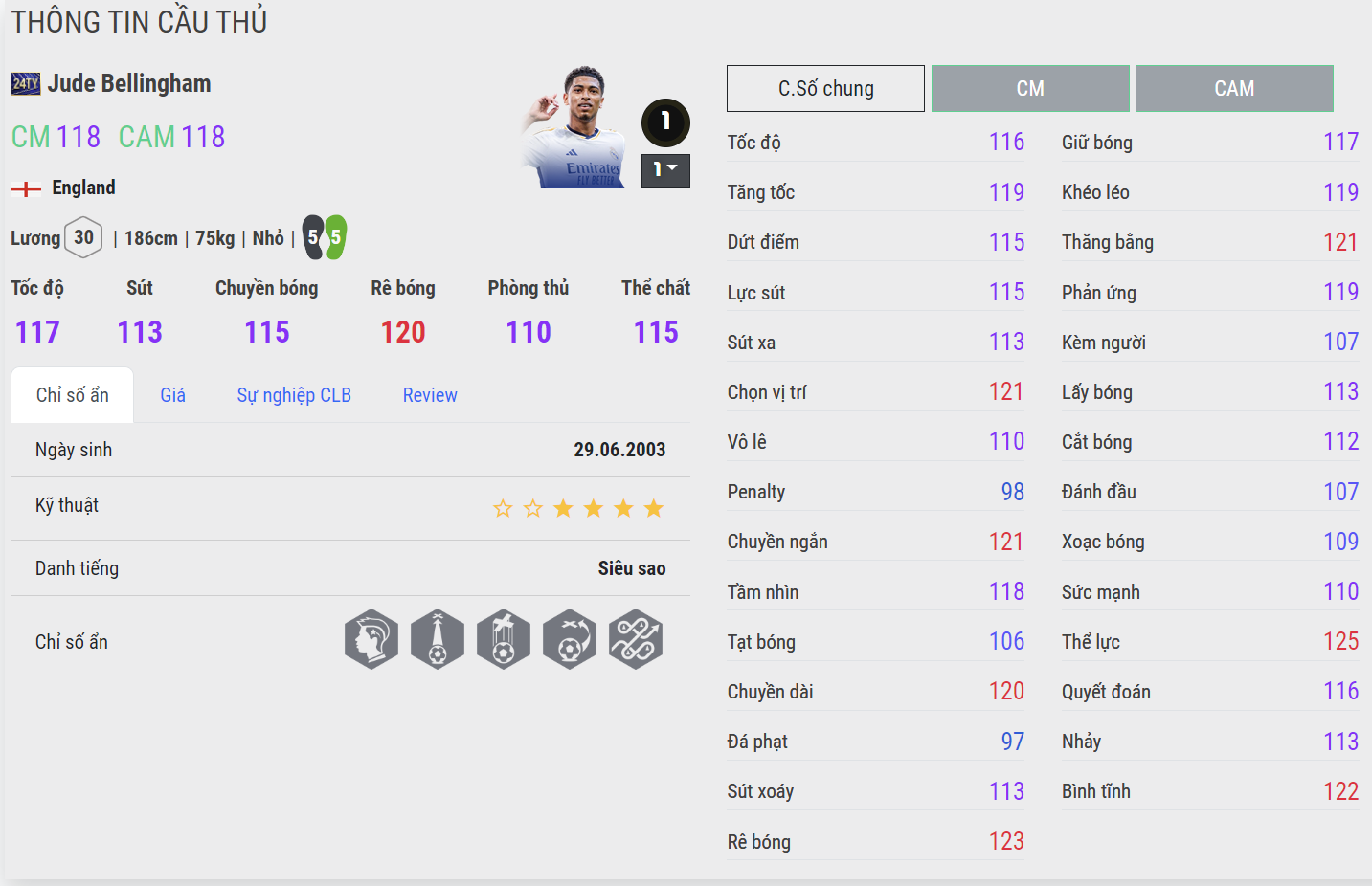Được đánh giá cao ở mùa thẻ 24TY, tuy nhiên Bellingham lại không được đánh giá quá cao về độ hiệu quả khi chỉ nằm ở top 4. Cầu thủ người Anh rất đa năng cả ở khả năng tấn công lẫn phòng ngự. Tuy nhiên điểm hạn chế nằm ở kỹ năng sút xa chưa thực sự ấn tượng khiến Bellingham không được các HLV giành nhiều sự ưu ái trong việc bình chọn cho vị trí CM.