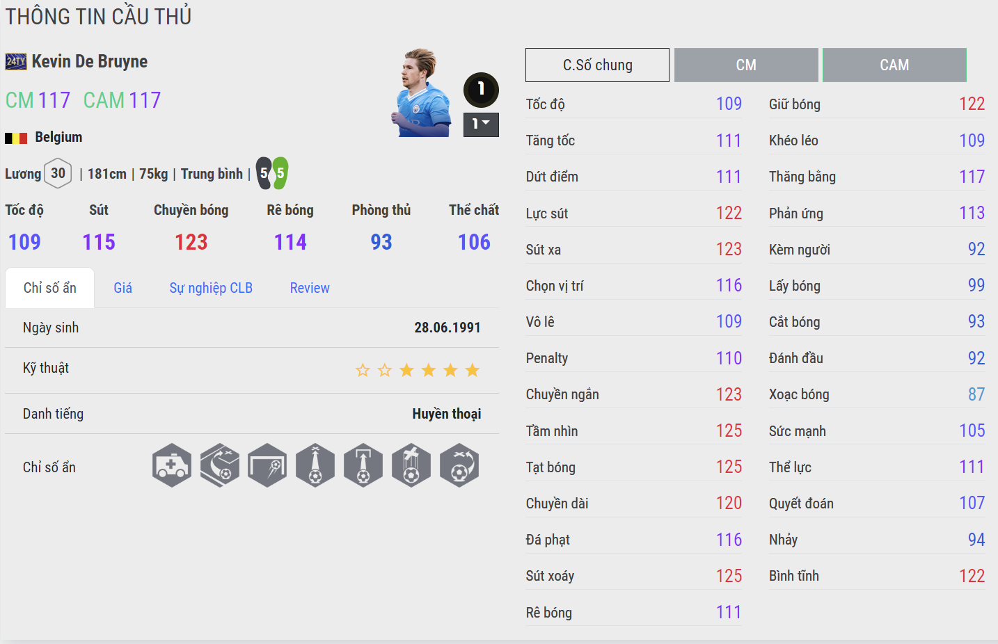 Tiền vệ người Bỉ vẫn đang là cái tên đương đại hay nhất cho vị trí tiền vệ trung tâm thời điểm hiện tại. Khả năng chuyền bóng hay, phối hợp tốt, kỹ năng chọc khe ảo khiến cho việc tham gia tấn công với De Bruyne là rất hiệu quả. Khả năng sút tốt cả trong lẫn ngoài vòng cấm cùng AI di chuyển thuộc hàng top game khiến De Bruyne được săn đón hàng đầu ở mùa 24TOTY