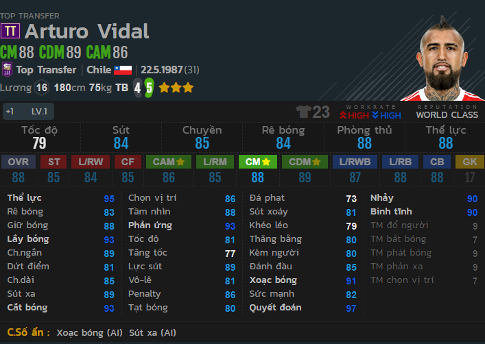 Tốc độ của Vidal ở thẻ mùa giải này đã được cải thiện lên rất nhiều so với mùa TB. Cùng với đó là khả năng phòng ngự cũng như tấn công cực kì tốt. Vidal sở hữu thể chất tuyệt vời cùng kỹ năng phòng ngự tốt khiến anh rất mạnh trong tranh chấp tay đôi. Mức lương 16 không thật sự ảnh hưởng quá nhiều, đổi lại mức giá để sở hữu vidal lại khá thấp.