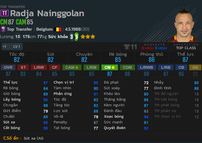 Là một trong những cầu thủ được đánh giá cao bởi khả năng phòng thủ vững chắc và ổn định. Với mức lương là 15, khá dễ thở với 1 vị trí tiền vệ trung tâm. Ở thẻ mùa giải này, tốc độ của Nainggolan đã được cải thiện đáng kể, khả năng phòng ngự 1vs1 được cải thiện rõ rệt. Nainggolan cho thấy được rất nhiều những sự hiệu quả trong game với một mức giá khá rẻ so với top tiền vệ nhưng đem lại hiệu quả tuyệt vời.