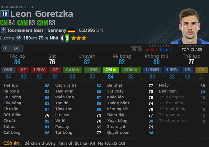 Một trong những cầu thủ trẻ được đánh giá khá cao hiện nay. Khác với Nainggolan, Goretzka có khả năng tấn công và kiểm soát tuyến giữa tốt. Khả năng cân bằng trong lối chơi của Goretzka là rất tốt. Tốc độ tốt và khả năng rê dắt cũng như lắt léo trong những pha tấn công của Goretzka là rất ổn. Khả năng dứt điểm của Goretzka cũng là rất tốt. Lương 15, mức lương khá hợp lý và mức giá cũng là vô cùng phải chăng với 1 mẫu tiền vệ Box-to-Box điển hình