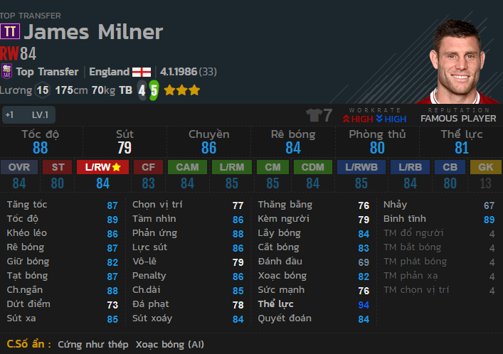 Một cái tên vô cùng lạ trong danh sách này. Vị trí sở trường là RW tuy nhiên nếu nhìn vào bộ chỉ số tổng quát cũng như chỉ số ẩn, có thể thấy được Milner là một vị trí Tiền vệ trung tâm Box-to-Box điển hình. Tốc độ và tăng tốc của Milner là rất tốt, Khả năng phòng ngự cũng là rất ổn với vị trí tiền vệ trung tâm. Điểm hạn chế của Milner là khả năng dứt điểm chỉ ở mức trung bình. Lương 15 và mức giá khá rẻ cho vị trí tiền vệ trung tâm Box-to-Box dành cho những ai là fan của Liverpool hay đơn giản là thích trải nghiệm những cầu thủ đặc biệt.