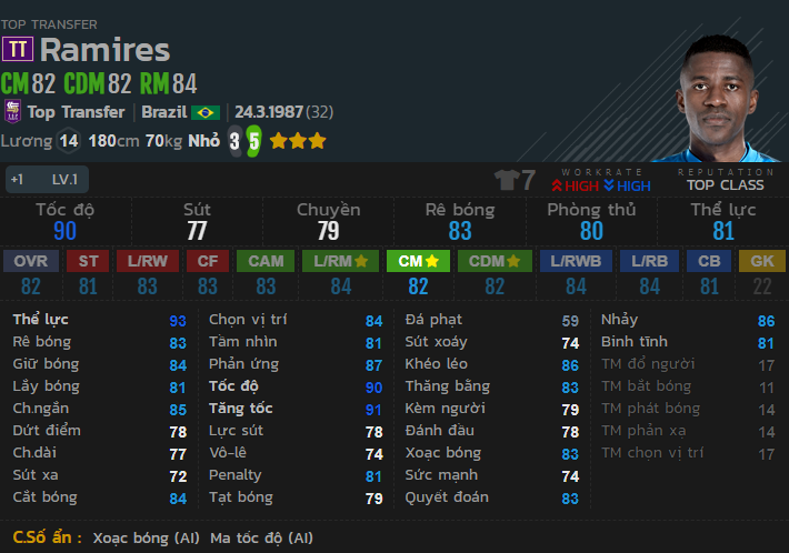 Với chiều cao 1m80,có cảm giác như Ramires di chuyển vô cùng mềm mại và có tốc độ rất nhanh. Phổ biến rộng rãi ở rank Hàn bởi tốc độ và sự linh hoạt vô cùng cao. Tuy nhiên không chỉ có vậy, Ramires vẫn đem lại sự hiệu quả ở cả khả năng chọn vị trí,chuyền bóng, giữ bóng, rê bóng, thăng bằng cũng như phòng ngự. Với mức lương 14 và mức giá khá rẻ như hiện nay, Ramires thực sự là 1 cái tên đáng lưu ý.