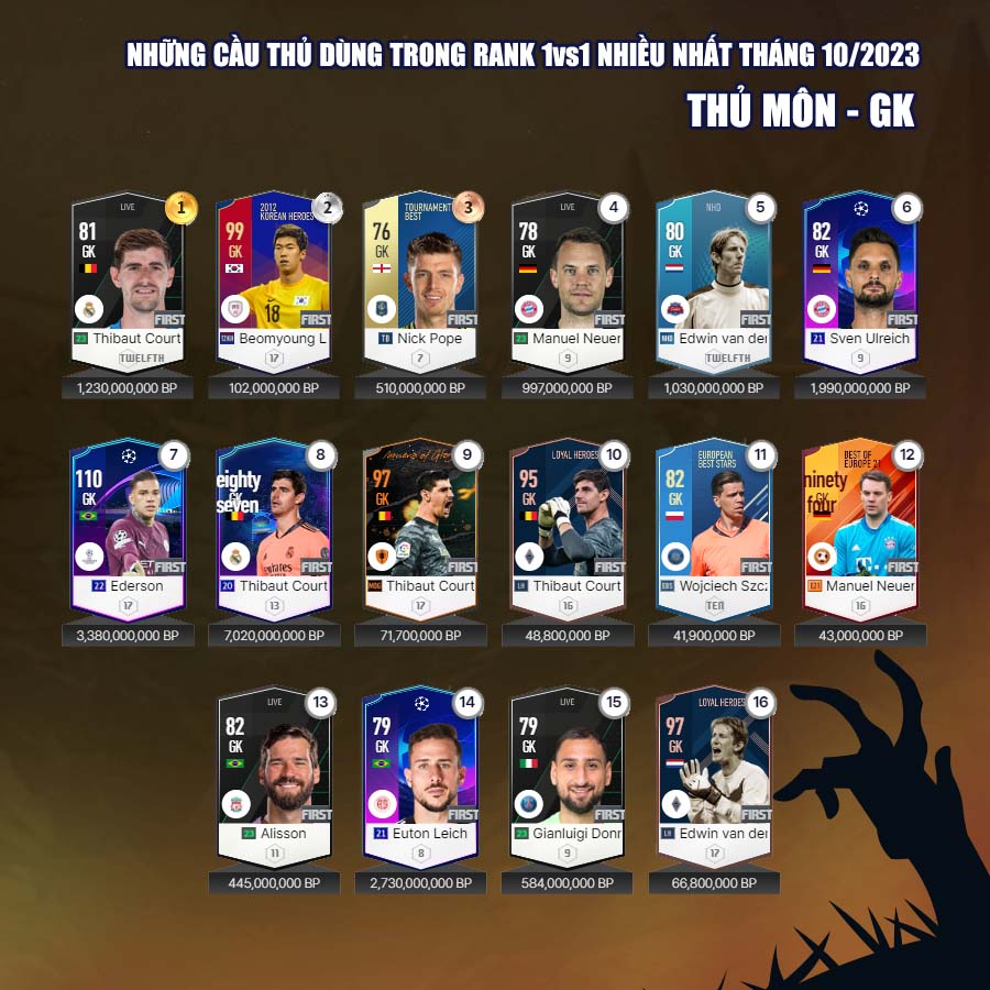 Mùa giải Century Club có lẽ sẽ còn có "hạn sử dụng" ít nhất trong vòng 6 tháng đến 1 năm tới khi mà FC Online bắt đầu đi vào giai đoạn thoái trào, và tất nhiên đầu tư cho một cầu thủ để sử dụng lâu dài vẫn là bài toán kinh tế hiệu quả nhất. Dưới đây là những cầu thủ của từng vị trí được các HLV ưa chuộng nhất trong tháng 10 vừa qua tại sever Hàn Quốc.