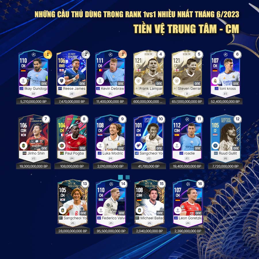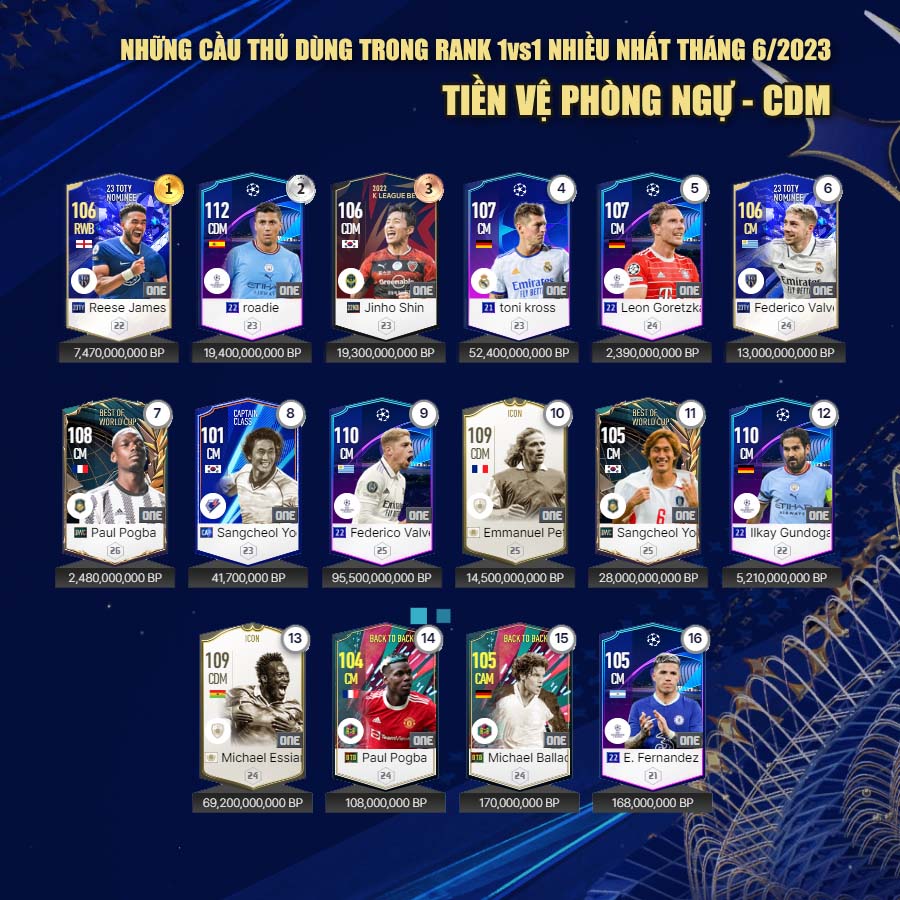 Vị trí CDM chứng kiến hai cái tên nổi bật của mùa giải 22UCL với nhà đương kim vô địch Man City là Rodri và Gundogan. Chất lượng của hai thẻ cầu thủ này thì đã được cộng đồng xác nhận là cực ổn, với gameplay 9.0 thì hiện tại vị trí CDM cũng đã được các HLV chú trọng hơn khi nhìn chung mặt bằng chung đều dùng các cầu thủ có mức lương 23 trở lên