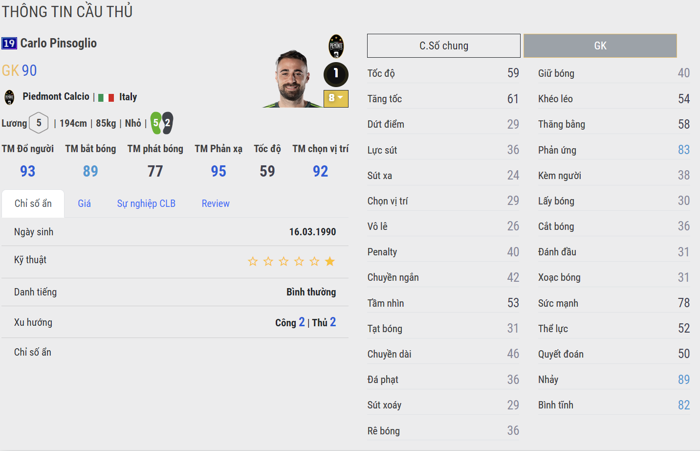 Thủ môn thuộc biên chế Juventus là một trong những thủ môn khá nổi bật dù ít ai biết. Thể hình cao ráo, sải tay dài giúp Pinsoglio khá mạnh trong những tình huống cả phá những pha sút xa và ZD của đối thủ. Với mức lương chỉ là 5, đây được xem là một thủ môn cân lương cực kì chất lượng của team Juventus hoặc Italy.