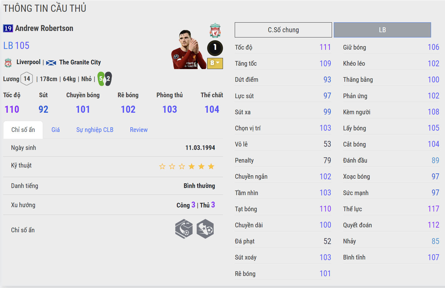 Vị trí hậu vệ phải khó có ai qua được Robertson ở phiên bản 19UCL. Sở hữu tốc độ và kỹ năng tạt bóng cực kì chính xác, đây là 2 mục quan trọng mà meta hiện tại rất cần cho vai trò hậu vệ. Với mức lương 14, Robertson cho thấy giá trị sử dụng cao hơn rất nhiều so với như hậu vệ biên khác bên hành lang phải.