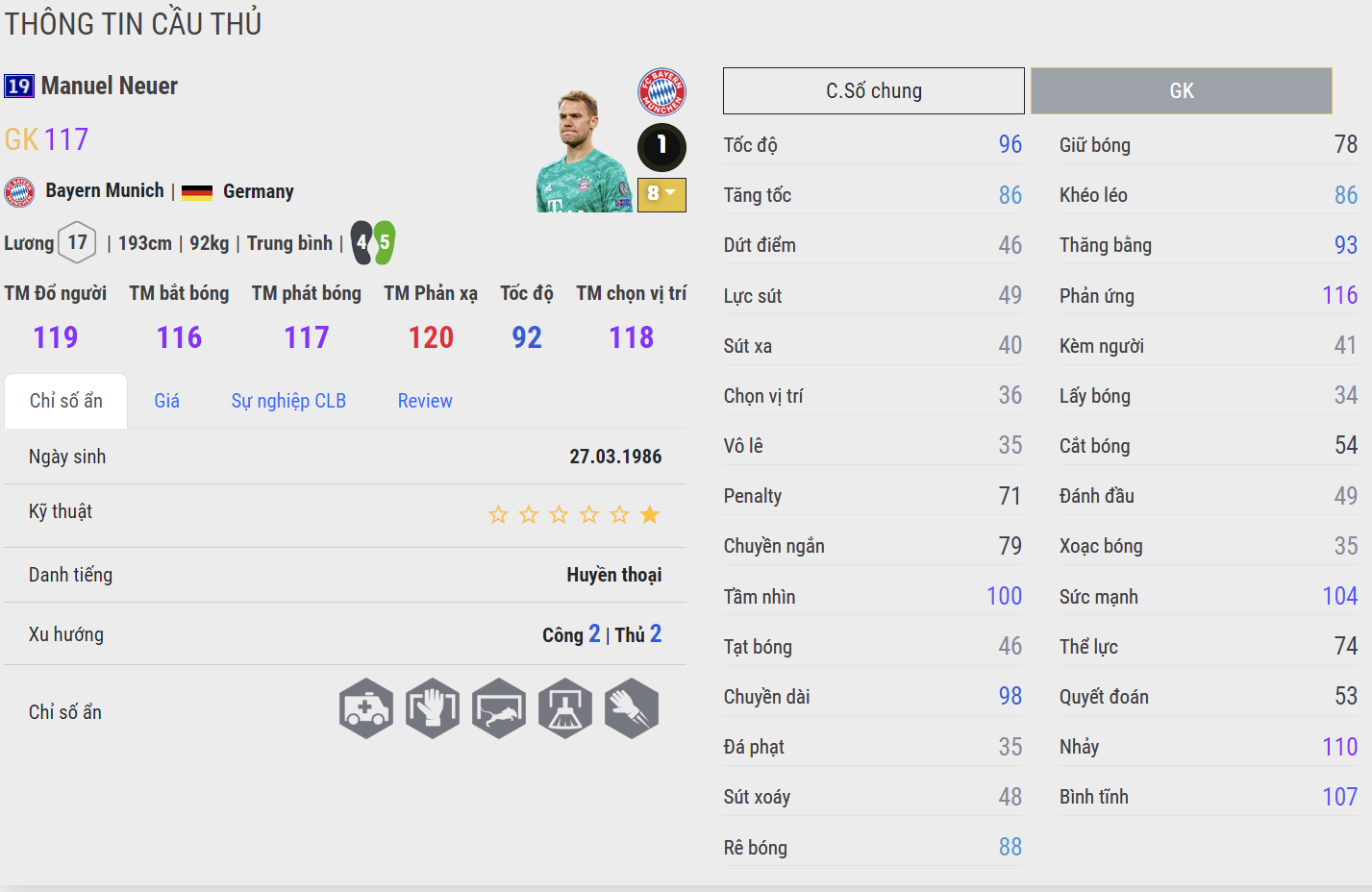 Với việc vô địch mùa giải năm đó cùng Bayern, Neuer được xem là một trong những thủ môn có giá trị sử dụng rất cao với mức lương chỉ ở 17. Khả năng phản xạ tốt, đối mặt rất ổn và kỹ năng cản phá những tình huống sút xa với Neuer là cực kì hiệu quả ở phiên bản 19UCL. Với bộ chỉ số ẩn mà mọi thủ môn áo ước , Neuer xứng đáng đứng ở vị trí thủ môn hay nhất mùa 19UCL.