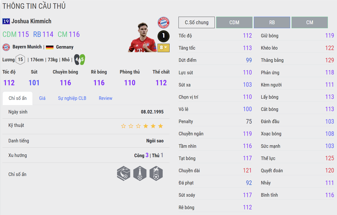 Đây là phiên bản mà hậu vệ phải của Bayern dần được chú ý hơn sau chức vô địch C1. Kimmich có bộ chỉ số rất đẹp dù mức lương chỉ ở 15, một trong những mức lương cực hời cho một cầu thủ đa năng khi vừa đá hậu vệ biên, vừa chơi như một tiền vệ trung tâm khi cần mà vẫn rất hiệu quả