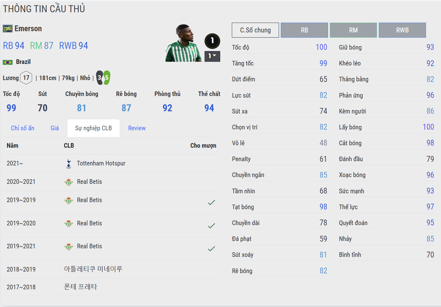 Với 2 team color Barca và Tottenham đều là những teamcolor có độ hot cao, Emerson là cái tên rất đáng sử dụng ở hành lang cánh phải cho 2 clb hàng đầu này. Lối chơi tốc độ, thể hình tốt, hỗ trợ phòng ngự và tấn công đều ổn là những điểm mạnh khiến Emerson phù hợp với meta hiện tại cho vị trí cân lương cánh phải.