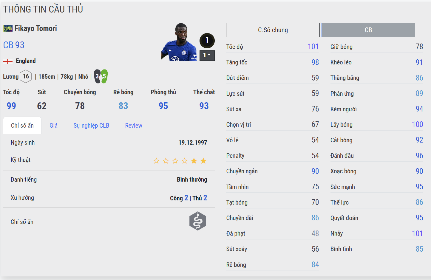 Tomori những mùa giải gần đây đang cho thấy sự hiệu quả rất lớn về mặt phòng ngự và được xem như quốc dân. Chủ yếu là ở tốc độ tốt và khả năng tắc bóng chính xác của mình. Mùa thẻ 20NG của Tomori nổi bật rất rõ 2 điểm cộng này khi ở mức thẻ cộng cao. Điều này khiến nhiều người chơi vẫn tin dùng cầu thủ người Anh cho team color Chelsea, AC Milan..