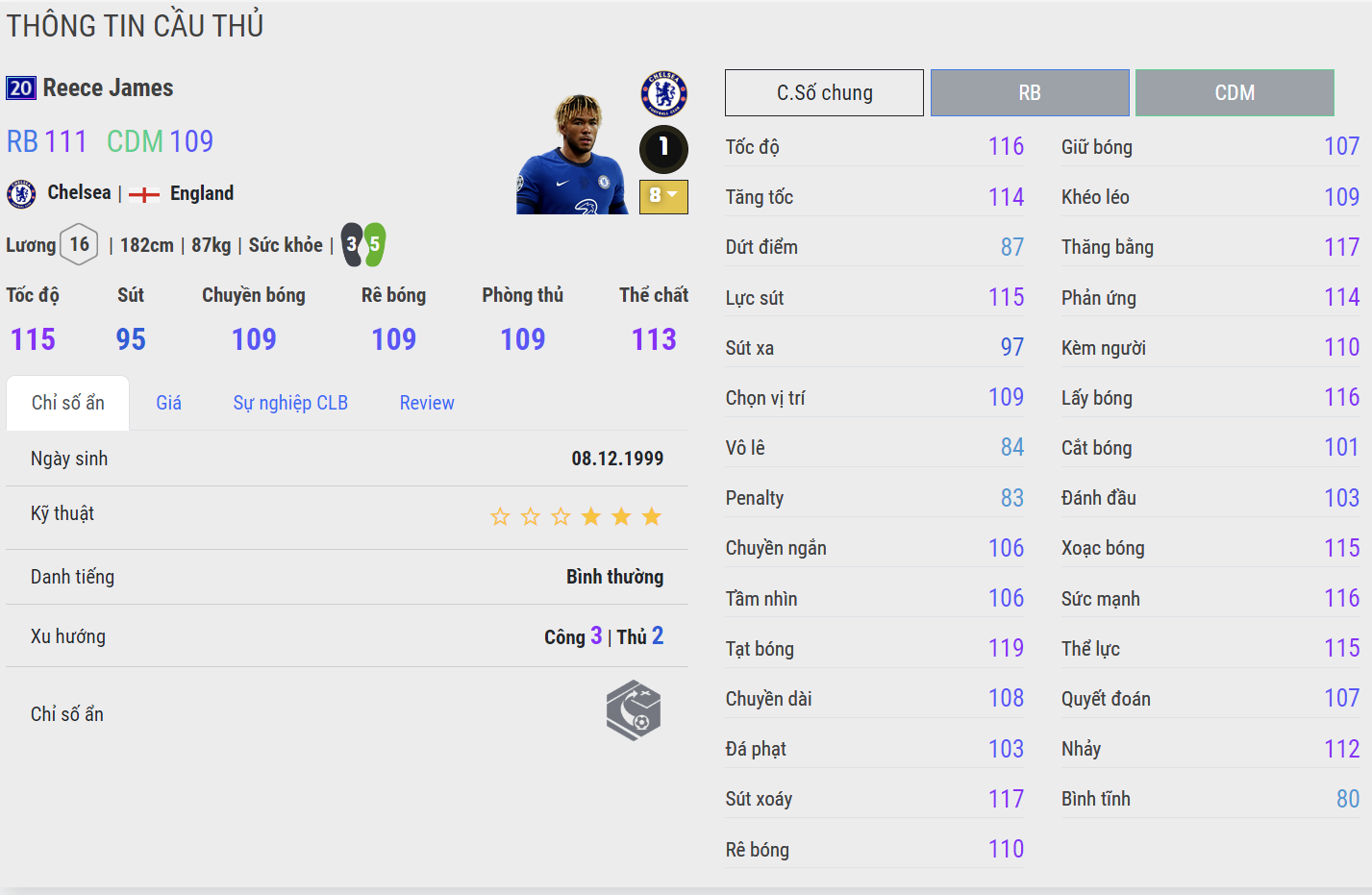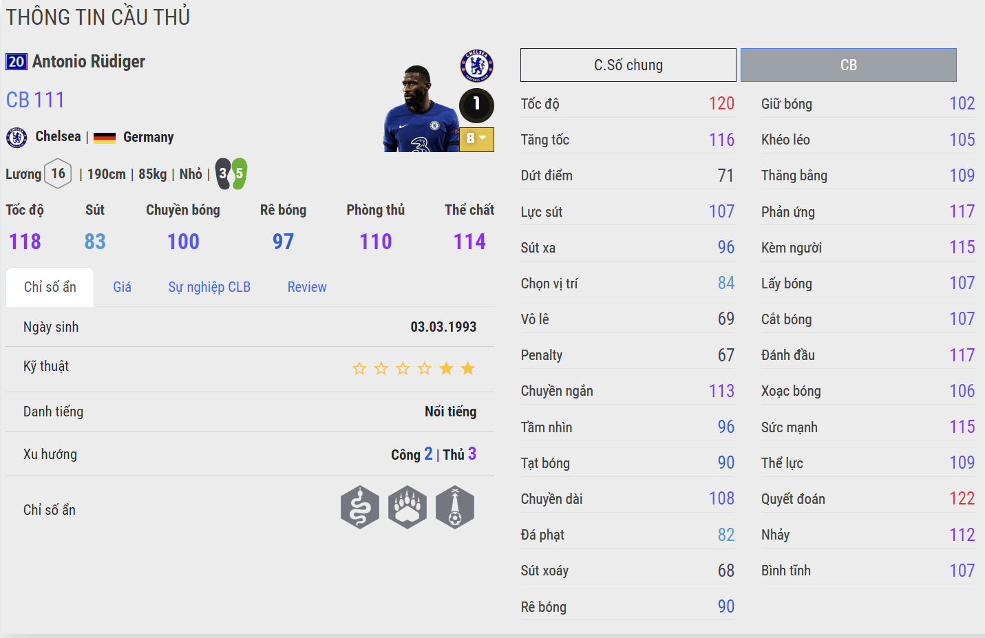 Dù trải qua rất nhiều mùa giải chất lượng nhưng Rudiger 20UCL vẫn cho thấy giá trị sử dụng cực tốt ở mức thẻ cộng cao. Tốc độ tốt, khả năng tì đè tranh chấp nổi bật cùng kỹ năng tắc bóng rất hay. Rudiger là mẫu trung vệ vẫn được xem là quốc dân ở thời điểm hiện tại. Những tình huống vào bóng của Rudiger là rất gắt và đem đến hiệu quả phòng ngự cực tốt.
