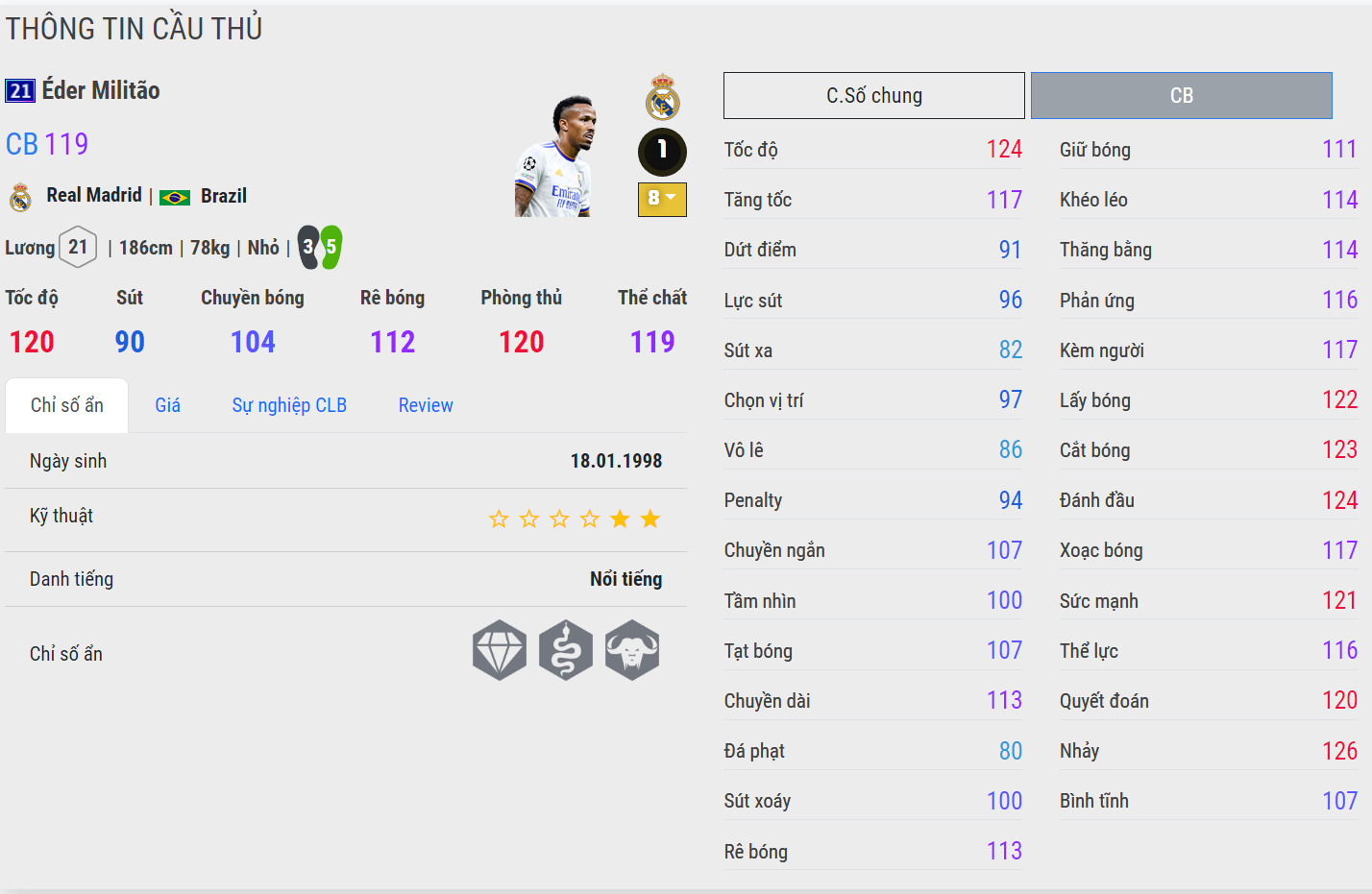 Trung vệ của Real Madrid có một mùa giải rất chất lượng với tốc độ tốt, kỹ năng phòng ngự hay. Khả năng đánh chặn với AI di chuyển bắt người của Militao là rất hay và có phần chủ động. Không chỉ có vậy, kỹ năng chọc chân cướp bóng của Militao là rất hay và với mức thẻ cộng cao, cẩu thủ Brazil hoàn toàn có thể trở thành một trung vệ lương thấp chất lượng.