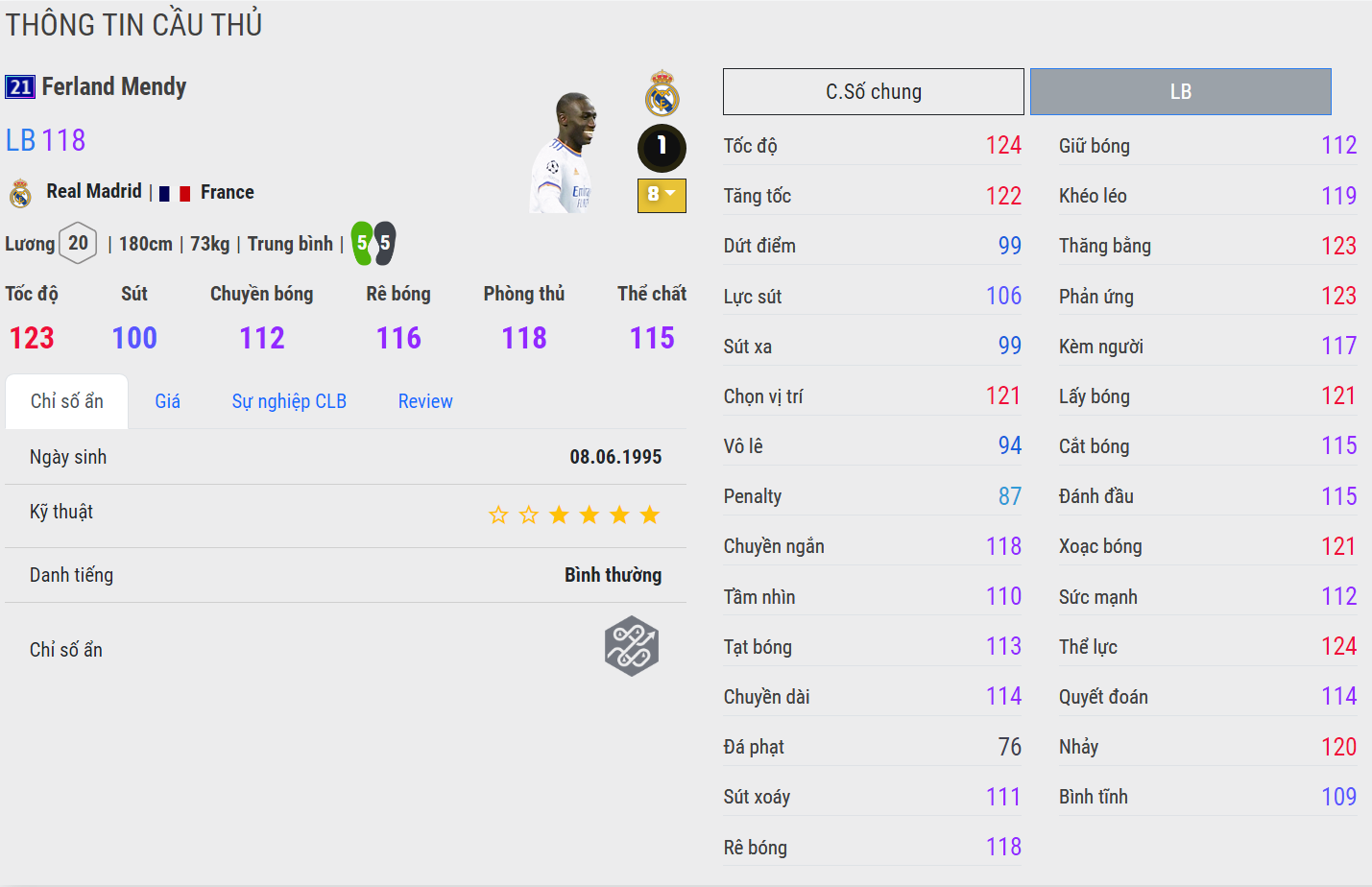 Sở hữu 2 chân 5 sao và bộ chỉ số phòng ngự cực đẹp cho hành lang trái. Mendy được xem là sự thay thế xứng đáng cho Marcelo trong team color Real. Nền tảng kỹ thuật tốt, tốc độ nhanh, khả năng hỗ trợ tấn công tốt và đặc biệt là kỹ năng phòng ngự của Mendy là rất hay. Không những vậy khả năng tranh chấp của Mendy cũng là rất tốt khiến anh không ngại so vai với bất kì cái tên chạy cánh nào của đối phương.