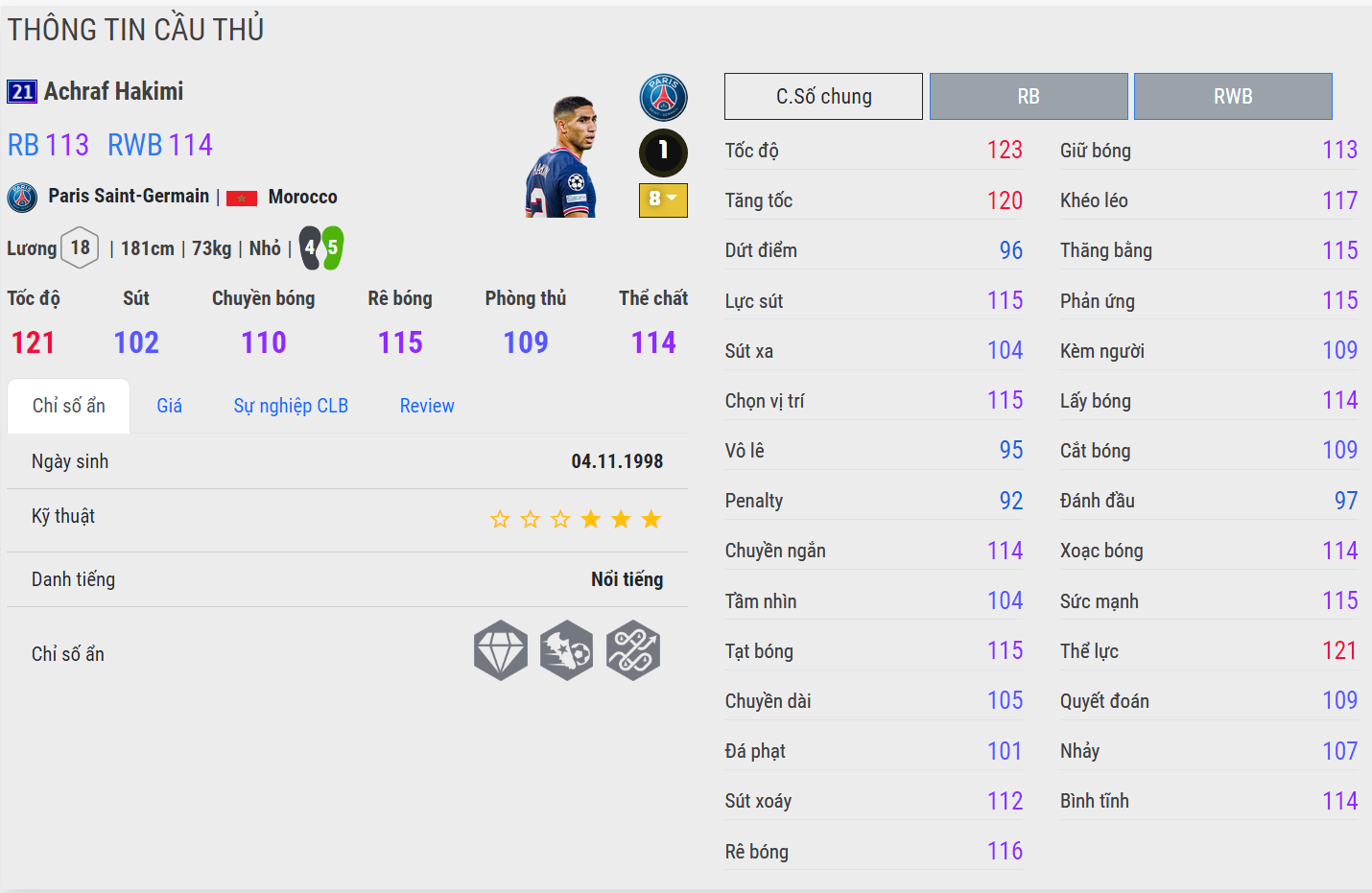 Có cho mình nhiều team color chất lượng như Real, Dortmund, Inter và PSG, Hakimi là mẫu hậu vệ cánh tương đối toàn diện và phù hợp meta hiện tại. Tốc độ tốt, kỹ năng tấn công hay với bộ chỉ số chuyền, tạt đều rất xuất sắc. Khả năng hỗ trợ phòng ngự hiệu quả cùng nguồn thể lực dồi dào khiến Hakimi có thể lên công về thủ cả trân mà không mệt.