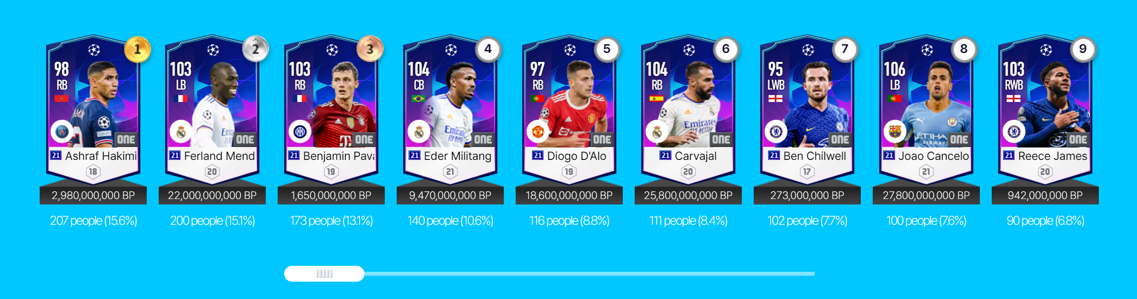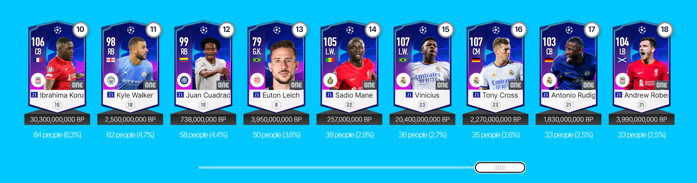 Mùa thẻ 21UCL có nhiều những cái tên chất lượng, đáng dùng và có bộ chỉ số khá ổn để các HLV tham khảo và đưa ra lựa chọn phù hợp cho đội hình đương đại của mình. Dù đã ra được khoảng 2 năm nhưng mùa thẻ này vẫn có giá trị sử dụng nhất định ở một số cầu thủ có AI tốt và được đánh giá ở mức độ hiệu quả cao.