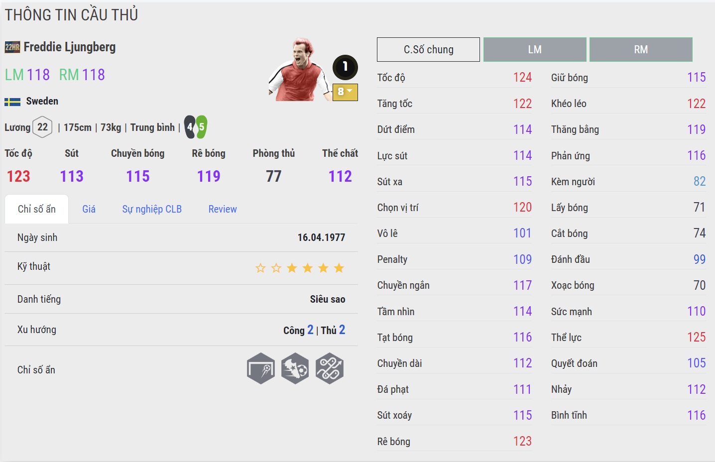 Tiền vệ cánh huyền thoại của CLB Arsenal là cái tên đầu tiên nằm trong danh sách. Sở hữu tốc độ cực tốt, khả năng bám cánh và thi đấu với vai trò chạy cánh tương đối ấn tượng khiến Ljungberg được đánh giá rất cao ở mùa 22HR. Với những HLV xây team color Arsenal, đây là cái tên không thể bỏ qua ở phiên bản +8 trong đội hình.