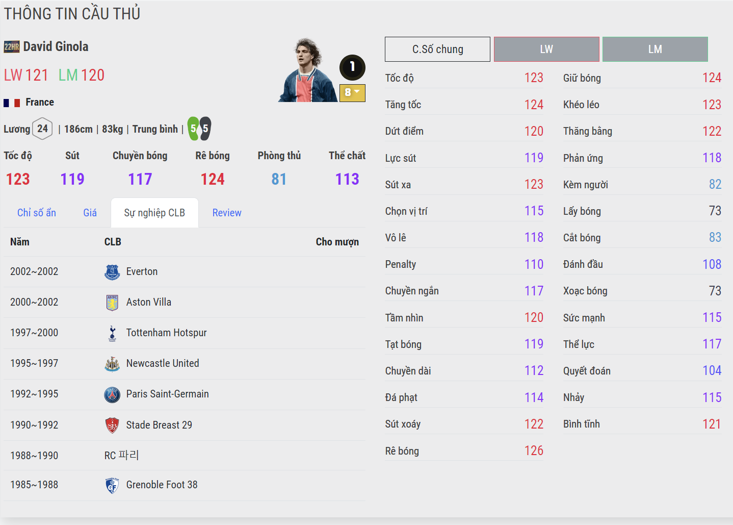 Được coi là cái tên xuất sắc bậc nhất mùa giải 22HR bởi sự toàn diện trên hàng công từ tốc độ, khả năng chọn vị trí, thể hình, và kỹ năng dứt điểm bằng 2 chân đều là những điểm mạnh của Ginola. Không những thế cầu thủ người Pháp còn có khá ít mùa thẻ trong FC Online và với việc mùa thẻ 22HR được nâng lên cộng 8 thì đây sẽ là mùa thẻ được săn đón bậc nhất game thời gian sắp tới.