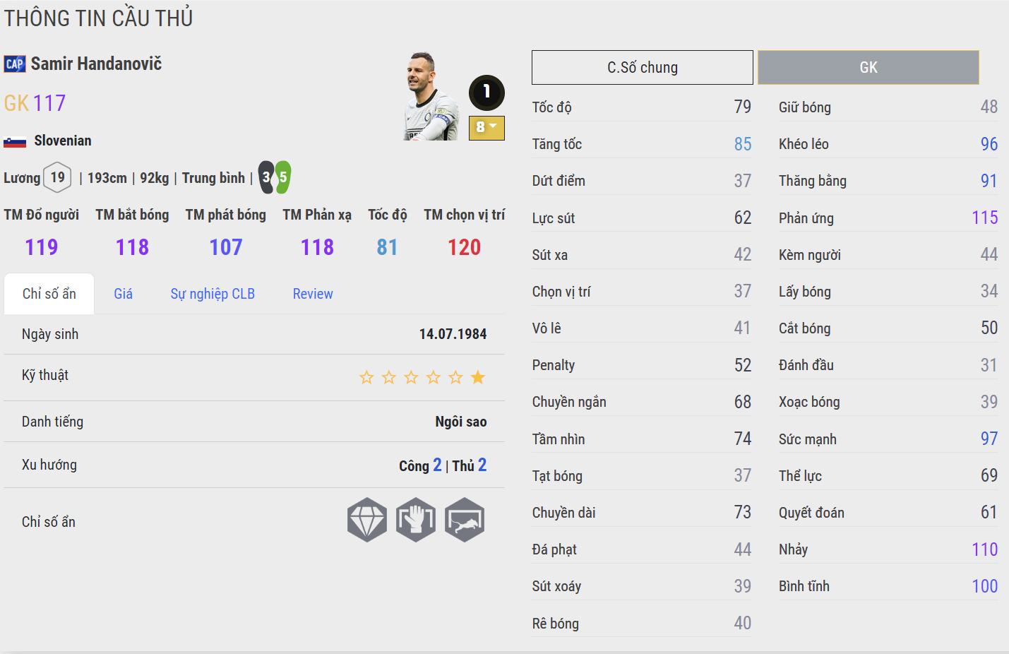Thủ môn của Inter được xem là cái tên cực kì hay trong khung gỗ. Sở hữu mức lương chỉ 19, kỹ năng phản xạ và khả năng bắt bóng của Handanovic là rất hay. Sải tay dài, tốc độ đổ người nhanh, khả năng đối mặt tốt là những ưu điểm của thủ môn người Slovenia. Đây cũng là một trong những thủ môn có giá trị sử dụng cao nhất của Inter.