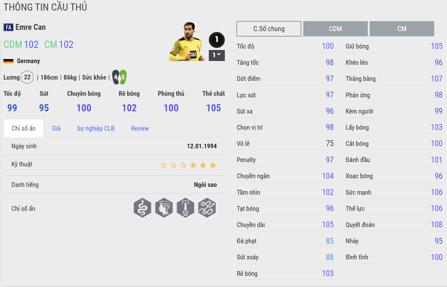 Đây được xem là mùa thẻ cực kì đáng dùng cho vị trí tiền vệ trung tâm của Emre Can. Cầu thủ người Đức có thể hình tốt, tốc độ, kỹ năng sút xa cho đến kỹ năng chuyền bóng đều ổn và khá đồng đều. Khả năng phòng ngự của Emre Can cũng là rất tốt và đây được xem như là một trong những mùa thẻ đáng dùng nhất của cầu thủ người Đức cho team color Dortmund, Liverpool hay ĐT Đức.