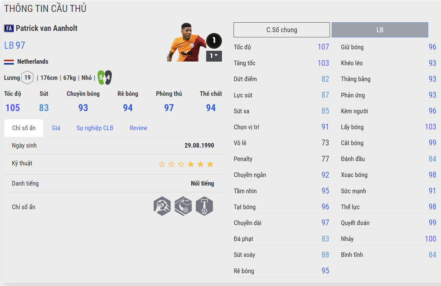 Có cho mình một team color cực hot đó là Chelsea, Van Aanholt còn là hậu vệ phải được đánh giá cao nhất ở mùa thẻ FA thời điểm hiện tại. Tốc độ tốt, kỹ năng phòng ngự ổn, khả năng hỗ trợ tấn công như chuyền bóng, phối hợp, sút xa cho đến tạt bóng đều đem đến hiệu quả cao. Với việc meta hiện tại ưa sử dụng những hậu vệ lương cao thì Van Aanholt là cái tên cực kì phù hợp.
