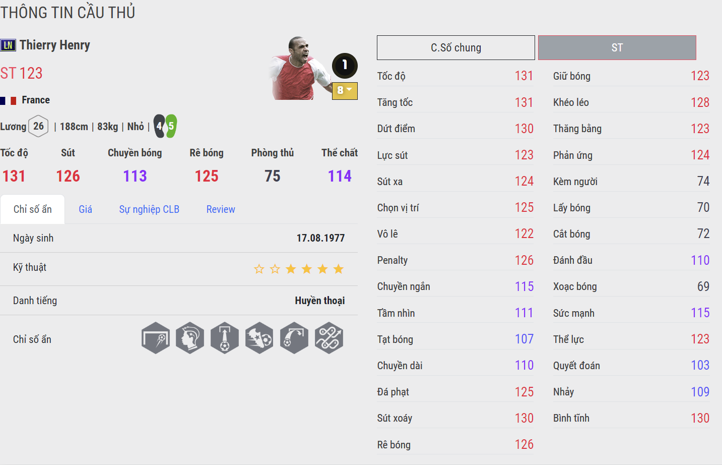 Tiền đạo người Pháp và team color Arsenal là cái tên đầu tiên góp mặt trong danh sách này. Sở hữu tốc độ và khả năng dứt điểm rất bén, Henry phù hợp cho lối chơi "đua xe bắn súng" quen thuộc mà nhiều HLV ưa thích. AI di chuyển thông minh cùng khả năng chuyền bóng cũng rất ổn định khiến giá trị sử dụng của Henry tăng cao. Ngoài ra anh còn có những team color hot như Arsenal, Barcelona, Juventus hay ĐT Pháp.