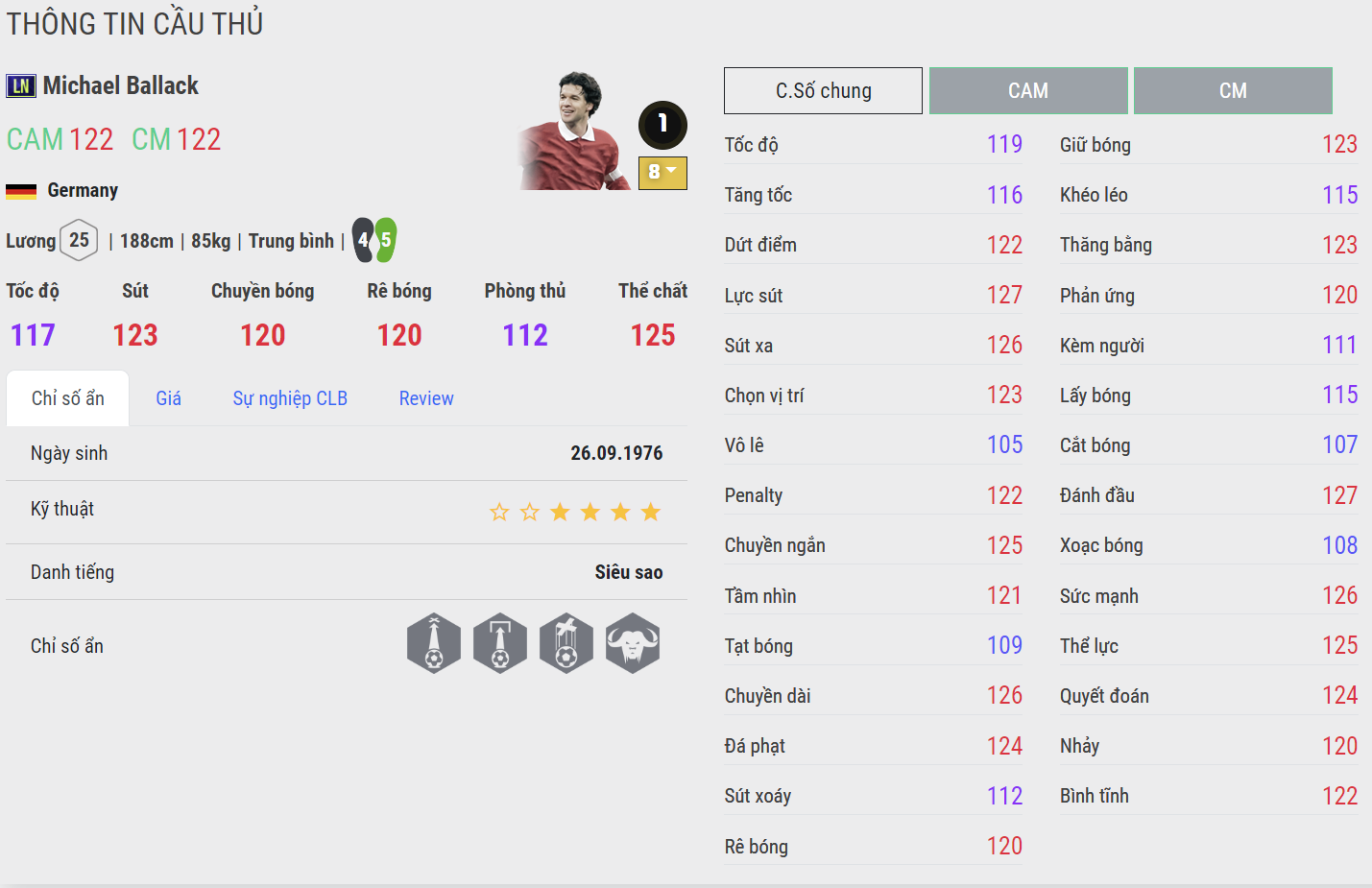 Được đánh giá là tiền vệ trung tâm hàng đầu game thời điểm hiện tại, phiên bản LN của Ballack là một phiên bản tương đối toàn diện từ thể hình thể chất, kỹ năng phòng ngự, khả năng chuyền bóng và sút xa rất tốt. Ballack là cái tên cực kì hot cho vị trí tiền vệ trung tâm khi anh gần như không ngại va chạm với bất kì cầu thủ nào cùng với khả năng sút xa cực kỳ ảo và chính xác cũng là rất cao.