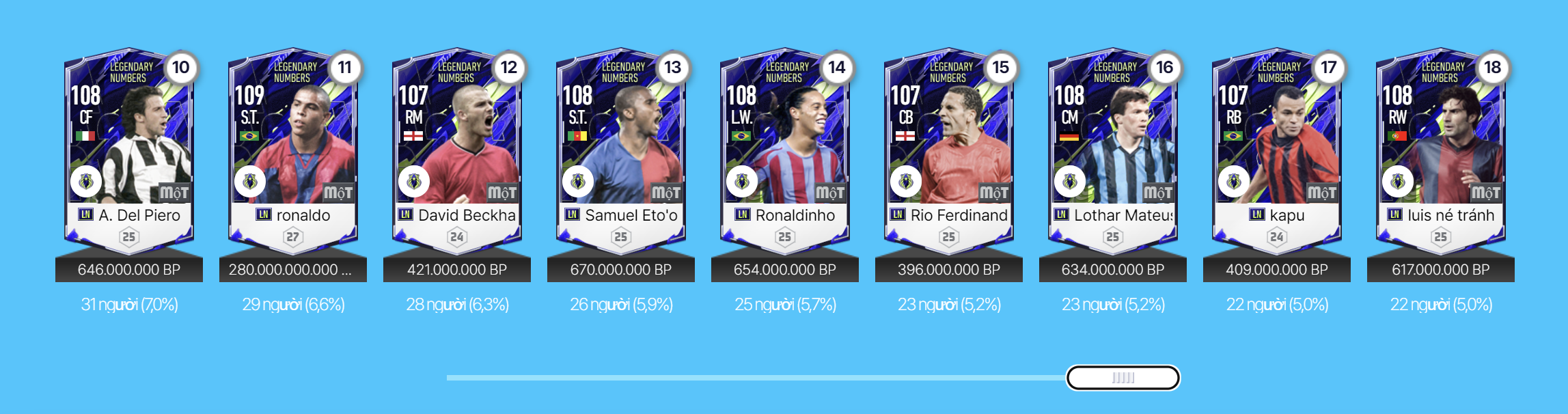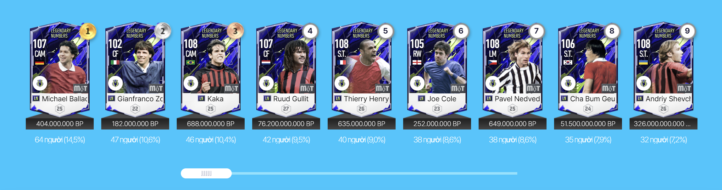 Nhưng điểm đáng chú ý nhất của mùa thẻ Legendary Numbers đó chính là tập hợp những huyền thoại giải nghệ từng khoác trên mình những số áo biểu tượng của bóng đá thế giới như số 3, 5, 7, 9, 10. Đây là mùa thẻ có rất nhiều những cái tên chất lượng và đáng dùng ngay cả ở mức thẻ cộng 5 đều cho thấy một giá trị sử dụng cực kì cao.