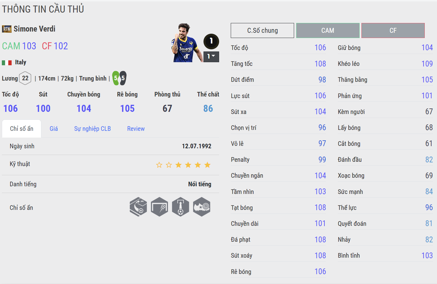 Tiền vệ tấn công người Ý được đánh giá rất tốt ở mùa thẻ RTN. Sở hữu 2 chân 5 sao, tốc độ tốt, kỹ năng dứt điểm đa dạng và hiệu quả từ sút xa, ZD cho đến sút cận thành bằng cả 2 chân. Không chỉ có vậy, khả năng chuyền bóng và tạt bóng tốt giúp Verdi hoàn toàn có thể đảm nhiệm được vai trò ở hành lang cánh. Sự đa năng của Verdi khi được nâng cấp lên cộng cao sẽ rất đáng dùng cho những ai đá team color Ý hoặc Napoli.