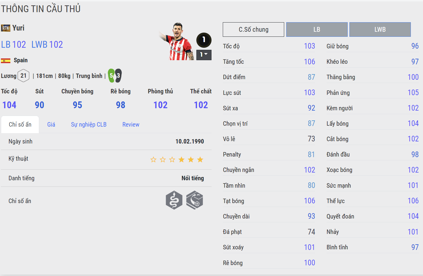 Hậu vệ cánh trái người TBN được đánh giá rất cao khi sở hữu tốc độ tốt, khả năng đua tốc rất khỏe. Yuri có thể hình to đầm, khả năng tranh chấp tốt cùng kỹ năng phòng ngự đánh chặn và lấy bóng thực sự ấn tượng. Không chỉ có vậy, điểm đáng dùng nhất của Yuri chính là ở khả năng tạt bóng rất hay và hiệu quả khi sử dụng trong các tình huống dâng lên hỗ trợ tấn công. Anh được đánh giá là hậu vệ biên đáng dùng mùa RTN cho team color TBN và PSG.