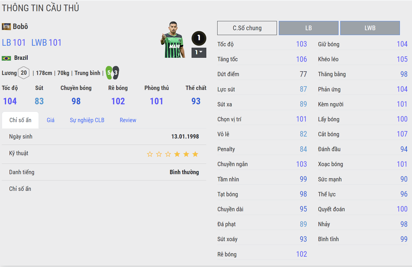 Bobo RTN đang là hậu vệ biên được nhiều HLV sử dụng trong team color Brazil. Sở hữu tốc độ tốt, thể hình đầm chắc và khả năng tì đè ổn, Bobo đang được rất nhiều game thủ chơi team color Brazil của Hàn sử dụng. Kỹ thuật cá nhân tốt, kỹ năng rê bóng tốt khiến cho Bobo tham gia tấn công khá hiệu quả. Khả năng chuyền bóng, rê dắt, tạt bóng của Bobo rất ổn. Đặc biệt là kỹ năng phòng ngự tốt với khả năng cắt bóng rất hay giúp Bobo trở thành mẫu hậu vệ biên điển hình ở meta hiện tại.