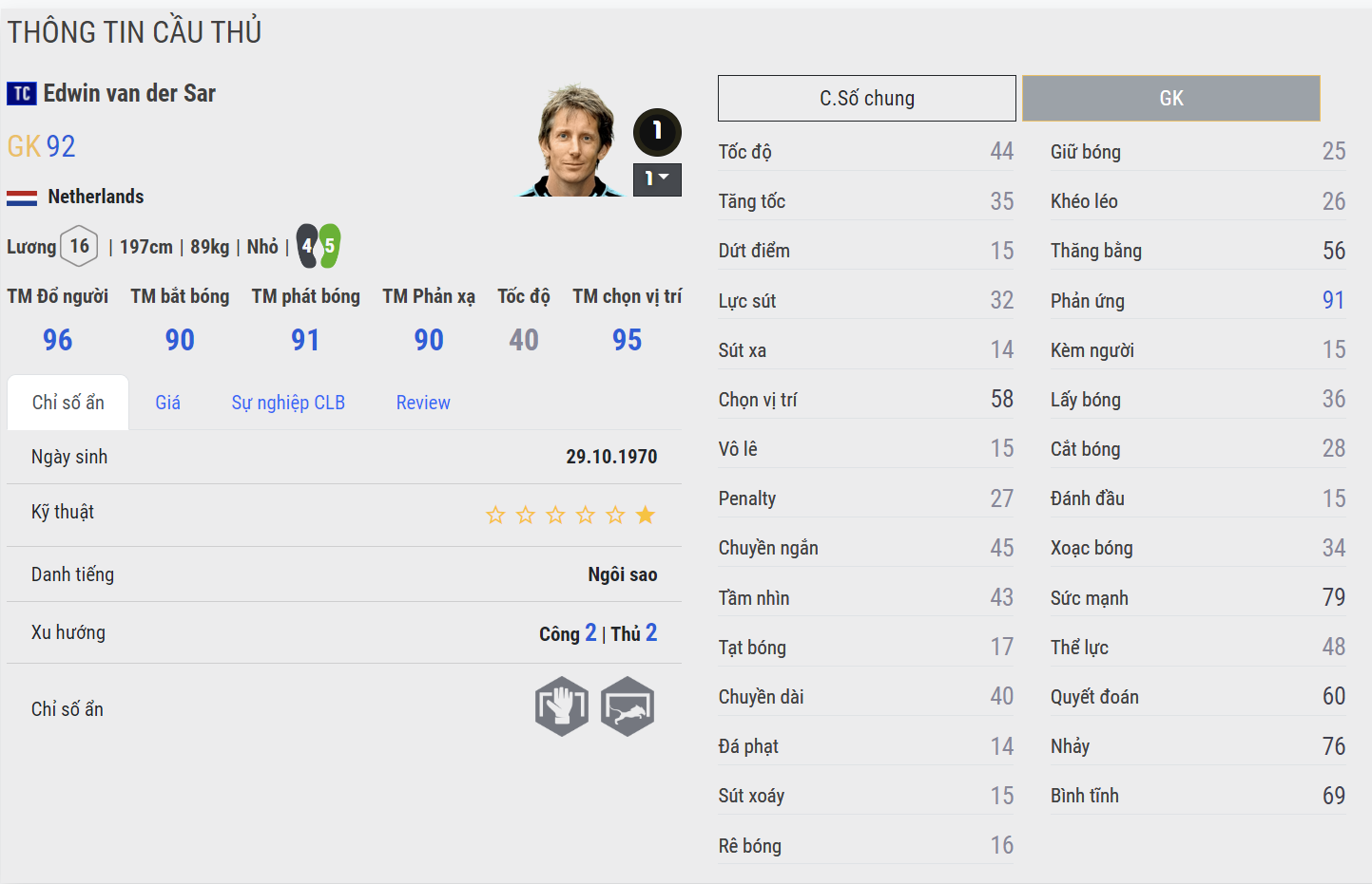 Thủ môn của Man Utd hiện là một trong những thủ môn đáng dùng với hiệu suất cản phá cực tốt. Không chỉ ổn ở khả năng cân lương, Van der Sar còn là mẫu thủ môn chống sút xa và sút ZD cực kì khó chịu. Chiều cao tốt cùng sải tay dài sẽ dễ dàng làm nản lòng những đối thủ có thói quen spam sút xa.
